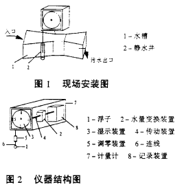 本儀器現場安裝結構如圖(1)所示,其原理是水通過水槽1(該設計是以帕歇爾水槽(Parshall)為標準),將水量變換成標準水位,由浮子3(參看圖2)帶動水位流量變換裝置4,該變換裝置將變換好的流量信號經傳動裝置6傳給顯示裝置5顯示瞬時流量,并同時經傳動裝置6將這一信號傳給記錄裝置10,這一裝置采用了自記鐘的原理,在特制的記錄紙上將流量信號按時間及日期記錄下來,記錄滿后由儀表操作者收回統計: