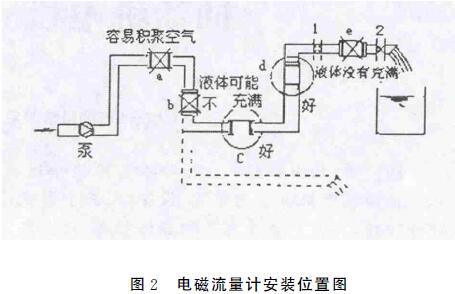 3.2.4對于電極可拆卸的儀表在安裝時方向錯誤。部分污水流量計的電極并非安裝在表體測量管壁上,而是與表頭一體并可拆卸,在安裝時要注意兩個電極的連線應與液體流向保持垂直。3.2.5液體未充滿管道,電極之間含有氣體。管道未充滿液體主要是管網工程設計或儀表安裝位置不當,使傳感器測量管內不能充滿液體。應避免安裝如圖所示a、e的位置和以虛線管排放時b位置,改裝到c,d位置較好。水平安裝時應使電極的連線保持水平,如果電極一上一下,下部電極會由于介質內雜質沉淀覆蓋電極,上部電極會由于氣泡堆積造成電極與介質絕緣。垂直安裝時應裝在流體自下而上流動的管道上,這樣更容易使液體充滿管道。