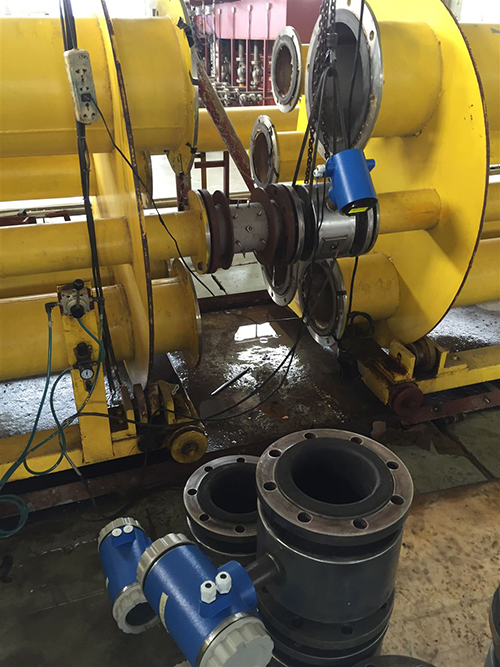 此時,如果具有一定電導率的流體流經(jīng)測量管。將切割磁力線感應出電動勢E。電動勢E正比于磁通量密度B,測量管內(nèi)徑d與平均流速v的乘積。電動勢E(流量信號)由電極檢出并通過電纜送至轉(zhuǎn)換器。轉(zhuǎn)換器將流量信號放大處理后,可顯示流體流量,并能輸出脈沖,模擬電流等信號,用于流量的控制和調(diào)節(jié)。