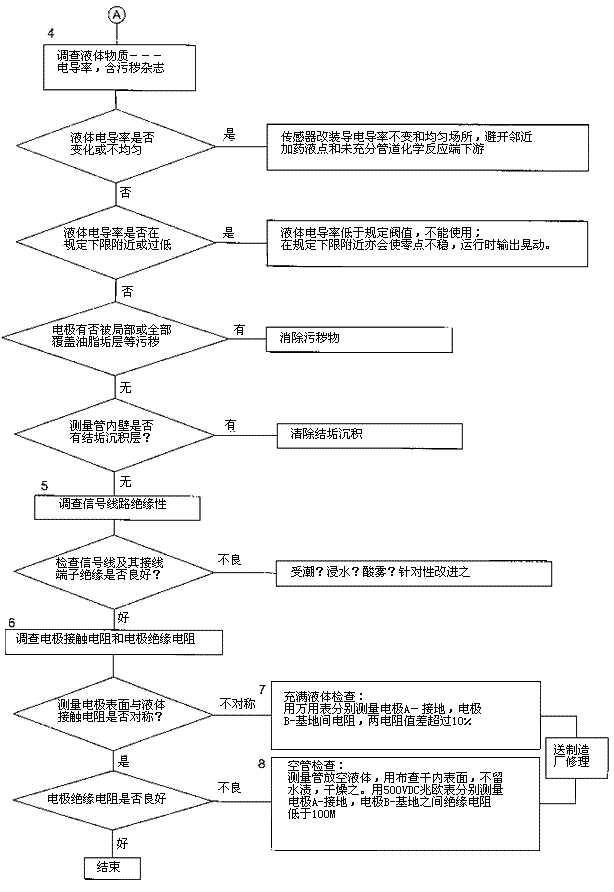 檢查流程圖*5項。信號回路絕緣下降會形成零點不穩(wěn)。信號回路絕緣下降的土要原因足,包極部位絕緣下降所引起的,但也不能排除信號電纜及其接線端子絕緣下降或破壞。因為有時候現(xiàn)場環(huán)境十分嚴酷,稍一疏忽儀表蓋、導線連接處密封不慎,彌漫著潮氣酸霧或粉粒塵埃侵入儀表接線盒或電纜保護層,使絕緣卜降。信號回路絕緣電阻檢查分別按電纜側(cè)和流量傳感器側(cè)兩郵分進行,用兆歐表測試。因信號電纜容易可先做。流量傳感器再分兩次進行:充滿液體測黽電極表面接觸電阻和個管后測量,U極絕緣電阻。