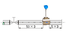 流量調(diào)節(jié)閥或壓力調(diào)節(jié)閥盡量安裝在傳感器的下游5D以遠處,若必須安裝在傳感器的上游,傳感器上游應有不小于50D的等徑直管段,下游應有不小于5D的等徑直管段。