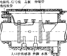 由于大口徑管道在多數場合下是埋在地下的,因此大口徑傳感器在安裝前應做好水泥地坑。圖6-19所示是在給排水系統中常見的安裝形式。水泥地坑應有足夠的活動空間,側壁埋有敷設電纜的鋼管,上有蓋板防止雨淋,下有泄水管以免坑內積水而使傳感器侵水。為了拆裝方便,傳感器應放在墊腳上,且在下游側裝有活絡的伸縮管。圖6-20是105%發煙硫酸流量計在地下水泥管污水排放系統中的安裝實例。