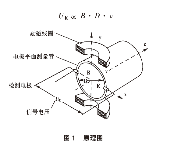 產生與流量成比例的感應電勢,流體中產生的感應電動勢被位于管子徑向兩端的一對電極拾取,該信號電壓uE與磁場強度B、電極間距離D和平均流速穢成正比。磁場強度B和電極距離D是常數,所以信號電壓與平均流速口成正比。計算公式如下:
