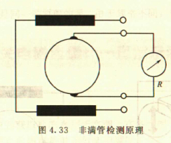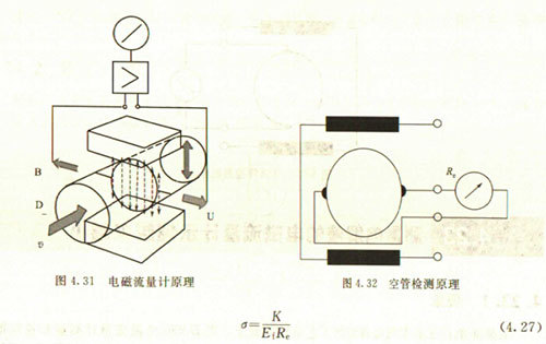 非滿管檢測也是基于電導(dǎo)率檢側(cè)的方法。在圖4.33所示的電磁流量傳感器中,增加了一個(或一對)非滿管檢測電極。當(dāng)導(dǎo)管內(nèi)液體滿管時,頂部電極與其他電極之間的電阻值很小;而當(dāng)存在非滿管情況時,頂部電極與導(dǎo)電液體之間有氣體阻隔,所以電極電阻顯著增大,從而做出非滿管判斷。