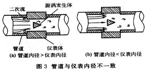 而丙烷流量計與安裝管道內(nèi)徑也會存在誤差,或大或小,如圖3所示,當被測介質(zhì)經(jīng)過時,也會發(fā)生二次流動,對測量結(jié)果產(chǎn)生波動影響。