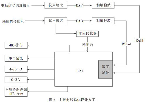 電極檢測出的微弱感應電動勢E, 先經前置放大器的放大和噪聲抑制而成為大幅度低阻抗的電壓信號。此信號經相敏檢波后,給CPU 進行數字濾波、處理和控制,通過利用雙線性變換法將模擬的二階巴特沃斯低通濾波器轉換為數字式濾波器,既簡化電路設計,且可靠性高、穩定性好。通過編寫軟件CPU 能對放大器的溫度漂移及零點漂移給予補償, 并在測量的全量程范圍內分10 段對信號進行非線性修正,使得測量值更好地擬合真實數據。空管檢測電路上,CPU 作為從控制器。當主控制電路上發出空管檢測查詢信號wire, 從控制器進行識別后接收并判斷出查詢什么信號,然后產生應答信號上傳至主控芯片輸出顯示;當檢測為空管信號時, 從CPU 發出的zero 信號通過控制MOS 管開關來關斷流速輸出。在應用中,對于微弱信號的放大及提取還需注意PCB 板設計時EMI 電磁屏蔽考慮,屏蔽來自空間磁場的干擾、周邊設備的輻射造成的干擾和板內之間的干擾,如數模分離、強弱電分離等等。