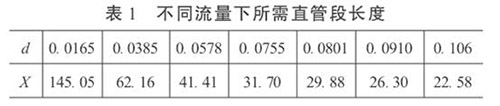 3.直管段長度和硅油流量計精度的初步預測在工程設計中,根據流體性質、流量和雷諾數確定α和d值。這樣,按照式(5)就可以依不同的流量計精度要求,對直管段長度進行初步預測,或確定直管段長度后,對流量計的精度做初步預測。當δ= 0.2%時,不同流量下所需直管段長度見表1。