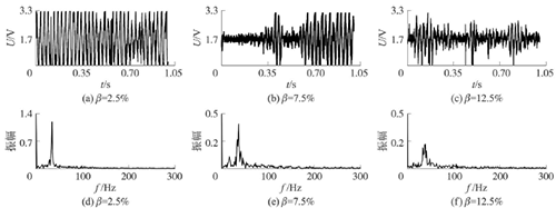 試驗發現,氣相的加入對乙烯流量計測量的影響顯著,譜分析和脈沖計數兩種方法隨著氣相注入的增加其表現也不同。圖4反映了水流量12m3/h時,注入不同氣含率β時A點的模擬信號,如圖4(a~c)所示;經譜分析后得到的頻率值,如圖4(d~f)所示;用脈沖計數方法得到的脈沖信號,如圖4(g~i)所示。圖4顯示,當注入氣量不大時,對乙烯流量計的影響不大,無論是譜分析結果還是脈沖計數得到的結果都比較好。當注入的氣量進一步增加時,渦街原始信號強度和穩定性逐漸變差,渦街頻率信號會被干擾信號所淹沒,反映到譜分析圖是,渦街頻率的譜能量減小,干擾信號的譜能量加強;對于脈沖信號,會因為一些旋渦信號減弱,形成脈沖缺失現象,而不能真實地反映渦街產生的頻率。