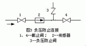 氟塑料襯里傳感器須謹慎地應用于負壓管系;正壓管系應防止產生負壓,例如液體溫度高于室溫的管系,關閉傳感器上下游截止閥停止運行后,流體冷卻收縮會形成負壓,應在傳感器附近裝負壓防止閥,如圖3所示。有制造廠規定PTFE 和PFA 塑料襯里應用于負壓管系的壓力可在200C、1000C、1300C時使用的絕對壓力必須分別大于27、40、50KPa。