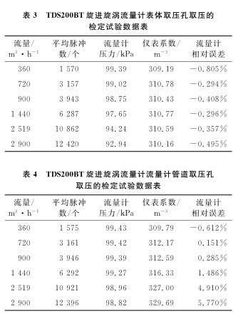以使用廣泛的DN100B天燃?xì)饬髁坑?/strong>為例,系統(tǒng)運(yùn)行時間為60s,標(biāo)準(zhǔn)裝置的滯止平均溫度為28.9℃,空間平均濕度為30%,流量計的平均溫度為28.3℃,在表體取壓孔取壓和管道取壓孔取壓的流量計檢定試驗(yàn)數(shù)據(jù)分別如表1、2所示。