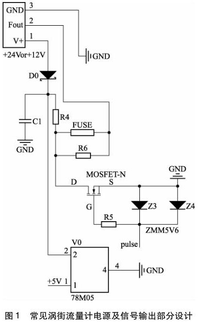 從圖1 中可以看到,供電電源 +24 V, +12 V均可,直流電源通過瓷片電容 C1 濾掉部分紋波,然后通過線性穩壓芯片 78M05,得到 + 5 V 電壓,為后面的氮氣流量計信號處理電路供電,若要再得到 3. 3 V 電壓,通常會在 78M05 后再加一片線性穩壓芯片 LM1117-3. 3,為了節約成本,供電電路沒有做 EMS 設計。同時,脈沖輸出部分,僅通過一個 MOS 管和兩個穩壓管,也沒有 EMS 方面的設計考慮。