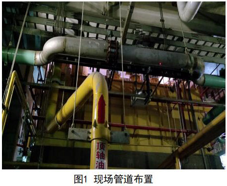 考慮兩臺機組管線布置和運行狀態完全一致, 下面僅提供#1機組的測量分析。圖1中頂軸油管上 部水平管道為凝結水補水管道。