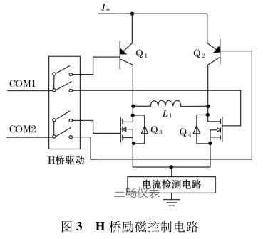由圖 3 可知,I o 為高低壓切換恒流控制電路輸出的恒流源電流,H 橋驅(qū)動的 COM1 端控制三極管 Q 1和場效應(yīng)管 Q 4 的通斷;COM2 端控制三極管 Q 2 和場效應(yīng)管 Q 3 的通斷。L 1 表示的是勵磁線圈(傳感器中線圈),COM1、COM2 為正交的 PWM 波信號,因此在勵磁線圈 L 1 的兩端會產(chǎn)生方波勵磁信號。檢流電路主要是用來檢測勵磁線圈中電流的變化,當(dāng)線圈中的勵磁電流方向變化時,可以及時將此信息反饋給高低壓切換恒流控制電路中的比較器,從而實現(xiàn)切換高低壓源達到恒流控制的目的。