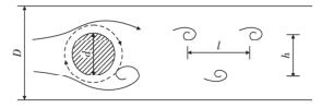 智能渦街流量計是由漩渦發生體、頻率檢測器和信號轉換器等環節組成,輸出 4 ~ 20 mADC 信號或脈沖電壓信號。其測量原理是在流動的流體中的垂直流動方向安放 1 根或多根非流體型阻流體,在一定的流量范圍內,流體在阻流體兩側交替地分離、釋放出 2 串頻率正比于管道內的平均流速、規則的、不對稱有規律的交替漩渦列,如圖 1 所示,且兩側漩渦旋轉方向相反 。采用檢測元件測出漩渦頻率就可以推算出流體的流量。