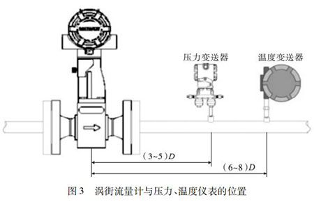 氫氣流量計的口徑如果與工藝管道相同,不能滿足流量儀表要求時,或者在此流速下測量準確度不能保證時,需要縮小儀表口徑,從而提高管內流速,保證測量精度。上下游必須有足夠的直管段,若傳感器安裝點的上游在同一平面上有 2 個 90°彎頭時,上游直管段≥25D,下游直管段≥5D。根據測量的需要,需在氫氣流量計附近測量壓力和溫度時,測壓點應在傳感器下游的( 3 ~ 5) D 處,測溫點應在傳感器下游的( 6 ~ 8) D 處,如圖 3 所示。