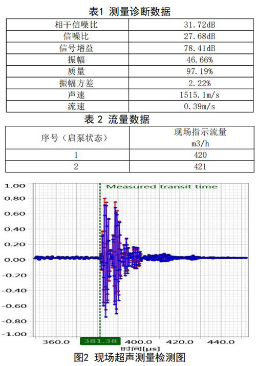 在高負(fù)荷段采用泵送補(bǔ)給水狀態(tài):測(cè)試時(shí)間 2018年10月11日,采用德國(guó)FLUEX高精度外夾式超 聲波流量計(jì)作為標(biāo)準(zhǔn)流量計(jì),測(cè)量基礎(chǔ)數(shù)據(jù):管道 外徑276.93mm,管壁厚度12.40mm,采用兩聲程169mm傳感器安裝距離,通過對(duì)超聲波流量計(jì)信號(hào) 分析與診斷(數(shù)據(jù)見表1、表2和圖2),診斷數(shù)據(jù) 提示標(biāo)準(zhǔn)超聲波流量計(jì)測(cè)量狀況佳,檢測(cè)開始,啟 動(dòng)補(bǔ)給水泵,運(yùn)行一段時(shí)間流量穩(wěn)定后,測(cè)量結(jié)果 如下: