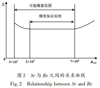 斯特勞哈爾數(shù) Sr 與雷諾數(shù) Re 之間的關系曲線如圖 2 所示。當阻流體尺寸確定后