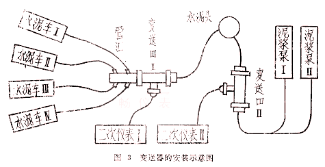 變送器II(重油流量計)安裝在水龍帶與水泥頭之間,信號送至二次儀表II,用以計量泥漿泵所替泥漿量