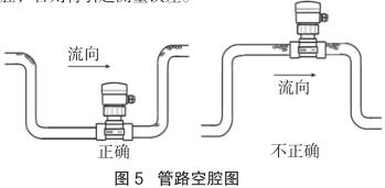 測量流向取決于智能型電磁流量計的安裝方位,將智能型電磁流量計在接頭上旋轉 180 度即可反向。正流向時,智能型電磁流量計的突耳應在上游方向。流量顯示總是正的,而累加器可以根據流向增加或者減少。安裝中確認管路設計不允許在介質中產生氣泡或空腔,否則將引起測量誤差(見圖 5)。