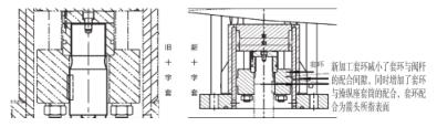 4)優化閥桿與閥座的對中性,由于原設計結構,閥桿與閥座的對中性不易保證,此次加工新導向十字套減小了套環與閥桿的配合間隙,同時增加套環與操縱座套筒的配合,優化后的導向十字套結構自身能夠保證閥桿的定位及對中,如圖3。