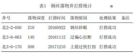 表1為氣體轉子流量計打撈統計表,可以看出自2016年9月開始即在現場進行了應用。為了展示試驗成果的普遍性,分別從不同注入方式、不同落物深度、不同落物原因的角度,共應用3口鋼絲落物井,打撈成功為100%。
