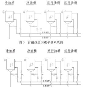 (1)改造后,各個油桶的油處理工作實現互不影響的效果。油桶排油支管的臨時接口兩端的球閥都是近油桶側的閥門,油桶進油支管的臨時接口ding部的球閥為近油桶側的閥門。油桶需進行油過濾工作時,僅需將濾油機的進油管接在該油桶排油支管新增的臨時接口上,同時濾油機的出油管連接在該油桶進油支管新增的臨時接口上,然后分別打開進油支管和排油支管新增臨時接口ding部的近油桶側球閥,即可開始形成循環油路進行油桶內的透平油過濾。同時未改變各個油桶中透平油的互相倒換、轉移功能。