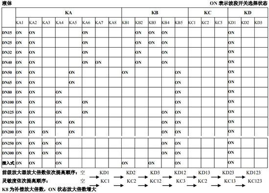 RG=1-F 調(diào)放大器增益,由 1 至 F 依次增大(常用 4-8);RS=1-F 調(diào)觸發(fā)靈敏度,由 1 至 F 依次提高(常用 4-8)不同口徑和介質(zhì)開關(guān)選擇參見附表。并根據(jù)實(shí)際信號(hào)先調(diào)整 K2 和 K3 擴(kuò)展頻帶,必要時(shí)調(diào)整 K1 電荷放大器增益
