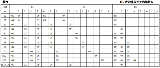 以上表值僅供參考,實(shí)際使用中因液體粘度和氣體密度不同應(yīng)在此值附近調(diào)整,頻率低時(shí)可將 K3 向大口徑方向調(diào)一至三檔。頻率高時(shí)可將 K2 向小口徑方向調(diào)一至三檔。
