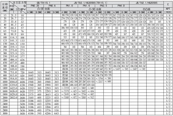 2.尺寸表中同一欄值有兩個并以/隔開,表示/下方的數(shù)值是以HG管法蘭尺寸計算所得。