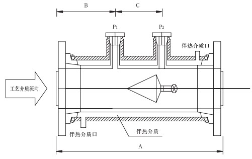 專門為測量要求夾套管伴熱工藝介質(zhì)的流量而設(shè)計,特別適合易結(jié)晶介質(zhì)及溫控要求嚴(yán)格的場合。鋼制夾套管法蘭標(biāo)準(zhǔn):SHT501-1997。