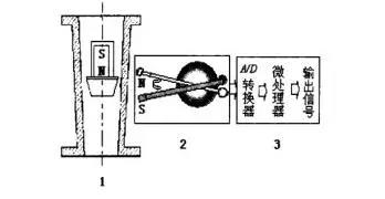 經典的浮子流量計是由浮子流量傳感器部分、位移一角度轉換機構部分以及信息轉換處理部分三個單元組成, 圖1-3給出了其機構示意圖。在流體測量中,被測介質流經傳感器的向上擴張的錐管時,浮子上下截面受到壓差阻力增大而向上移動,當受到的浮力、重力和壓差阻力達到平衡時懸浮在一定的高度,浮子的高度通常通過非接觸式的位移一角度轉換部分測量得到,通過信息處理單元對角度和位移進行轉換計量,這樣就可以根據浮子高度和流量之間函數關系通過計算得到被測介質的流量。所以準確的角度一位移計算是決定整個浮予流量計測量精度和穩定性的核心。浮子流量傳感器在結構形式上有錐管一浮子和孔板一直管浮子兩種形式,可見,流量傳感器的結構是否合理,位移測量的精度決定著流量計的測量精度。