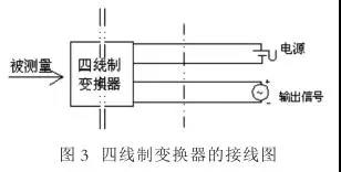 三線制變換器的接線圖如圖 2 所示,電流輸出系統除了兩根電流傳輸線以外,還有一根電源線向變壓器提供電源。三線制就是電源正端用一根線,信號輸出正端用一根線,電源負端和信號負端共用一根線。其供電大多為 DC 24V , 輸出信號有 DC4-20mA ,負載電阻為 250Ω 或者 DC0-10mA ,負載電阻為 0-1.5kΩ ;有的還有 mA 和 mV 信號,但負載電阻或輸入電阻,因輸出電路形式不同而數值有所不同。