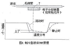 液體用tmf 在20世紀90年代初中期開始發(fā)展并在工業(yè)生產中應用,但當前主要為微小流量儀表。有消耗功率測量法的熱分布式tmf和利用珀爾帖( peltier)致冷元件在檢測部位致冷(即附加熱)的tmf。后者的測量原理如圖6所示,流量傳感器由測量毛細管、電子冷卻裝置(珀爾帖元件)和3各溫度檢出件組成。測量管和致冷元件接觸,無液體流動時冷卻到某一溫度時,兩者溫度相等;液體流動時致冷元件附近測量毛細管溫度上升,如虛線所示分布,測量溫度檢測點的兩者溫度差以求的流量。