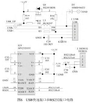 由Q1、R14、R15、R16、L3、D3、R8和R9等元件組成的電路與單片機(jī)對(duì)應(yīng)電路,組成等元件組成的電路與單片機(jī)對(duì)應(yīng)電路,組成USB快速接口電路。快速接口電路。IC9(SP3232EEY)芯片與周圍元)芯片與周圍元件組成RS232接口電路。電路如圖6所示。