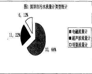 另外,還有水頭污水處理廠、葵涌污水處理廠、光明污水處理廠在建。根據上表可以看出,深圳市污水處理廠排污流量計的類型主要是3種,分布比例如下圖1所示。主要以電磁流量計為主,為33臺,占到超過一半