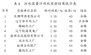 根據(jù)化工污水流量計(jì)選型的校驗(yàn)標(biāo)準(zhǔn),撫順市安裝的化工污水流量計(jì)選型運(yùn)行比較正常可做對(duì)比試驗(yàn)的有14臺(tái),對(duì)這14臺(tái)流量計(jì)分別進(jìn)行了對(duì)比試驗(yàn)。測(cè)試方法是采用標(biāo)準(zhǔn)儀器對(duì)所監(jiān)測(cè)的流量計(jì)進(jìn)行8h的連續(xù)平行監(jiān)測(cè),從試驗(yàn)結(jié)果中選出被檢流量計(jì)*大流量范圍的五點(diǎn)對(duì)比數(shù)據(jù)和累計(jì)流量對(duì)比結(jié)果,相對(duì)誤差小于5%的為合格。此次實(shí)際測(cè)試的有:撫順縣化肥廠、北方化工廠、撫順?biāo)喙煞萦邢薰尽⑦|寧能港發(fā)電廠、醇醚化工廠、遼寧華豐化工廠、天湖啤酒有限公司、腈綸化工廠8家企業(yè)。飛利鋁材、汽車鋁輪轂、老虎臺(tái)礦、石油一廠新廠因?yàn)闊o(wú)水未測(cè)試,石油二廠新排污口、乙烯化工廠因?yàn)槿鄙倭髁坑?jì)廠方配合未能測(cè)試。測(cè)試結(jié)果除華豐化工廠流量計(jì)相對(duì)誤差大于5%不合格外,其他均合格,見表1。